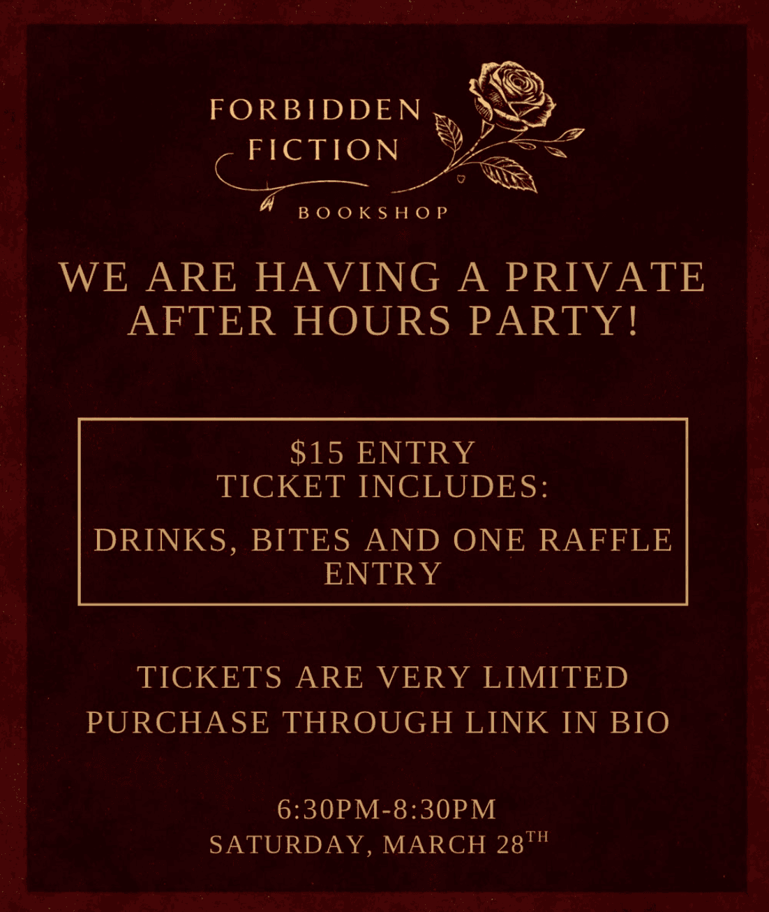 Join us for our phase one opening celebration. Meet local dark romance lovers, enjoy themed drinks, and be among the first to explore our curated collection. Limited tickets